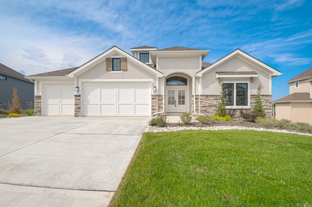 Located in Palisades Development in Riverside this open floor plan design has some amazing features. The main floor includes a living room with a vaulted ceiling, the kitchen has a large island with a wet bar, a walk-in pocket office or pantry, and a mud room off the kitchen. The primary bedroom is also on the main level with a walk-in closet off the bath that has double sinks, a soaking tub, and a walk-in shower. There is an additional bedroom or office located off the entry. This design also included a zero-entry garage feature. The basement includes two bedrooms with a Jack and Jill bathroom, a ½ bath, a family/rec room, and a bar. The exterior is comprised of stucco with stone and wood accents.